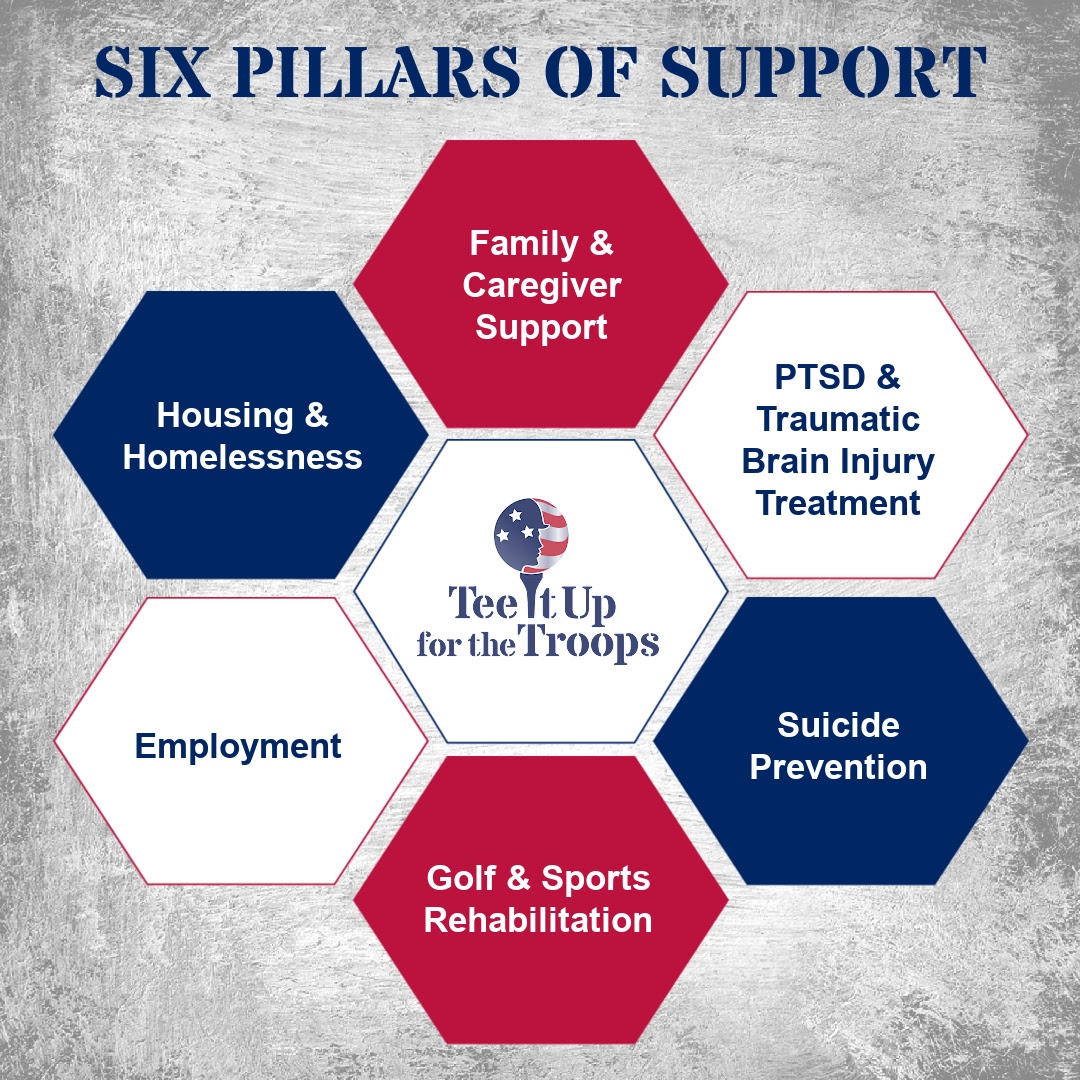 Tee It Up for the Troops supports programs that deliver critical services to help veterans transition from the battlefront to the home front. When a member of the military comes home, they face a variety of challenges. Unfortunately, many of those challenges are connected and spread into other parts of their life. Addressing one area many times isn’t enough. That’s why Tee It Up for the Troops has six pillars of support. By offering support for all these critical areas of need, we work to provide comprehensive assistance for veterans in all areas of their life. This support for our American heroes helps them get back on course and gives them the best chance of success once they’ve come home.